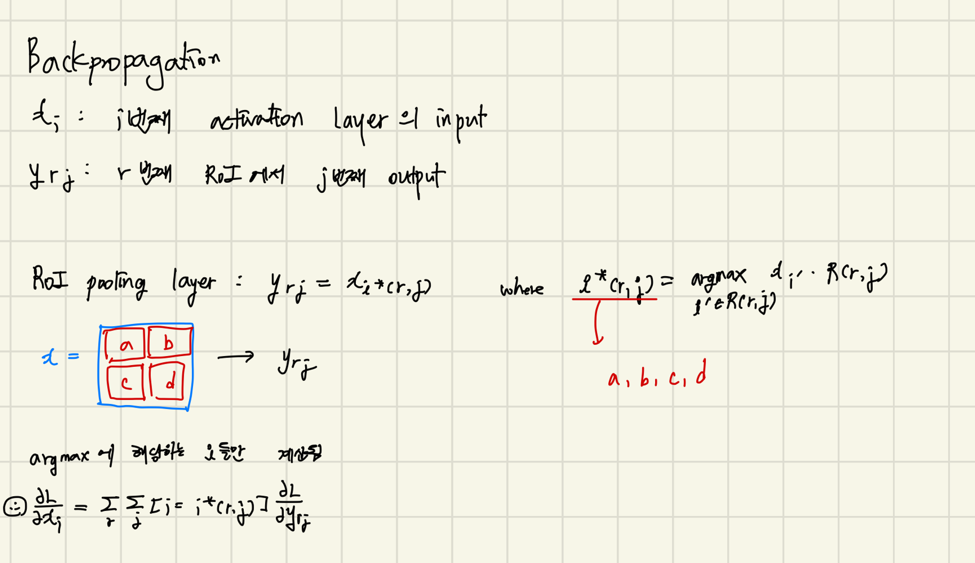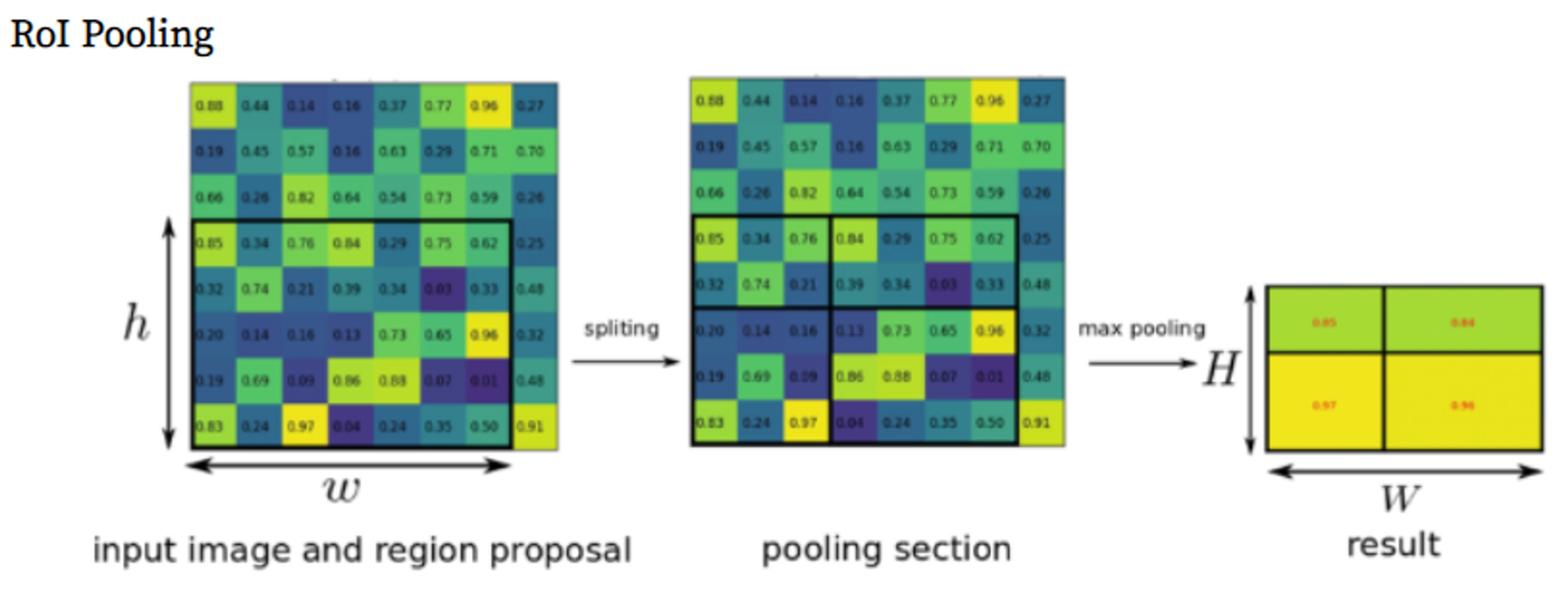 - hxw ROI window를H x W grid가 되도록 h/H x w/W 크기의 sub windows로 나눈다.
