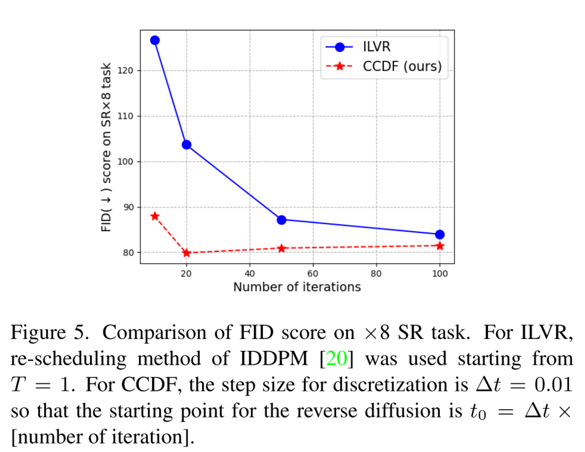 - ILVR에서 iteration수를 줄일 수록 이미지의 퀄리티가 떨어지는 반면 제안된 방법론은 FID score를 iteration이 적을때에도 비슷한 수준으로 유지함.