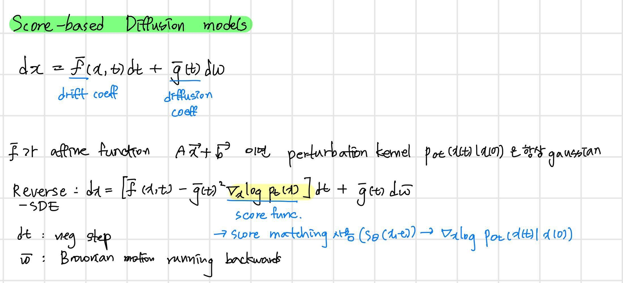 - SMLD(Score matching with Langevin dynamic)은 VE-SDE의 discrete version으로 볼 수 있음.