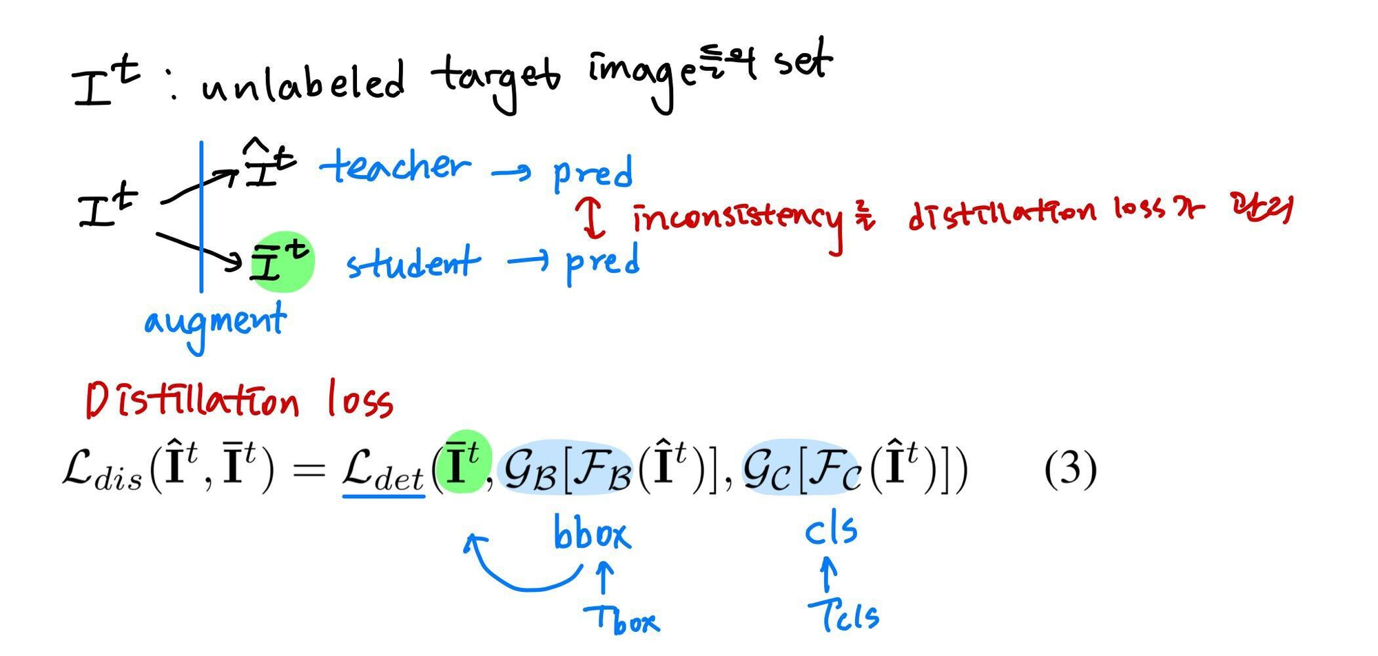 본 연구에서는 teacher model의 input으로 unlabeled target domain samples D_t만을 사용하고 Student model에서는 여기서 부분적으로 unlabled samples I^t를 사용해 학습한다. Distillation하는 동안 teacher model prediction들로부터 높은 probabilities를 갖는 bbox들을 선택해서 pseudo labels로 사용하고, stduent model은 target domain과의 variance를 줄여 robustness를 얻고자 한다.