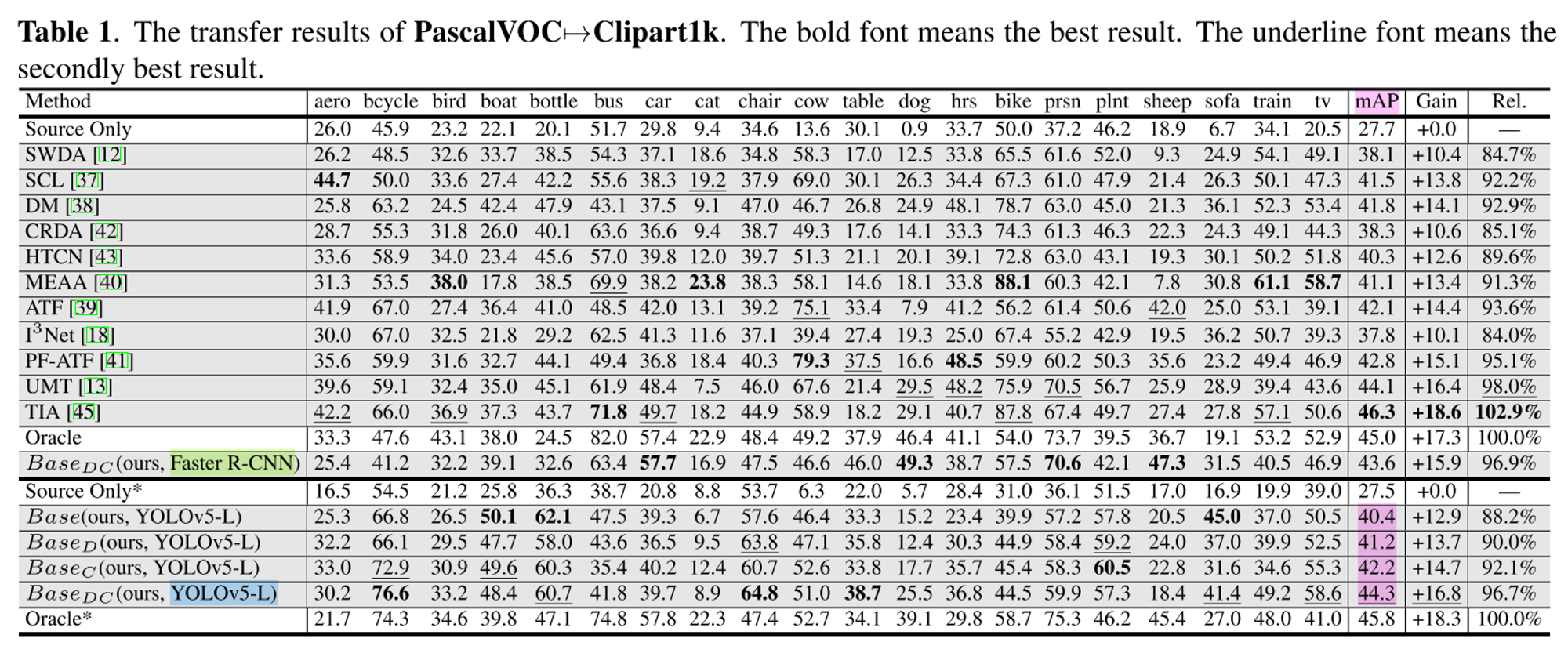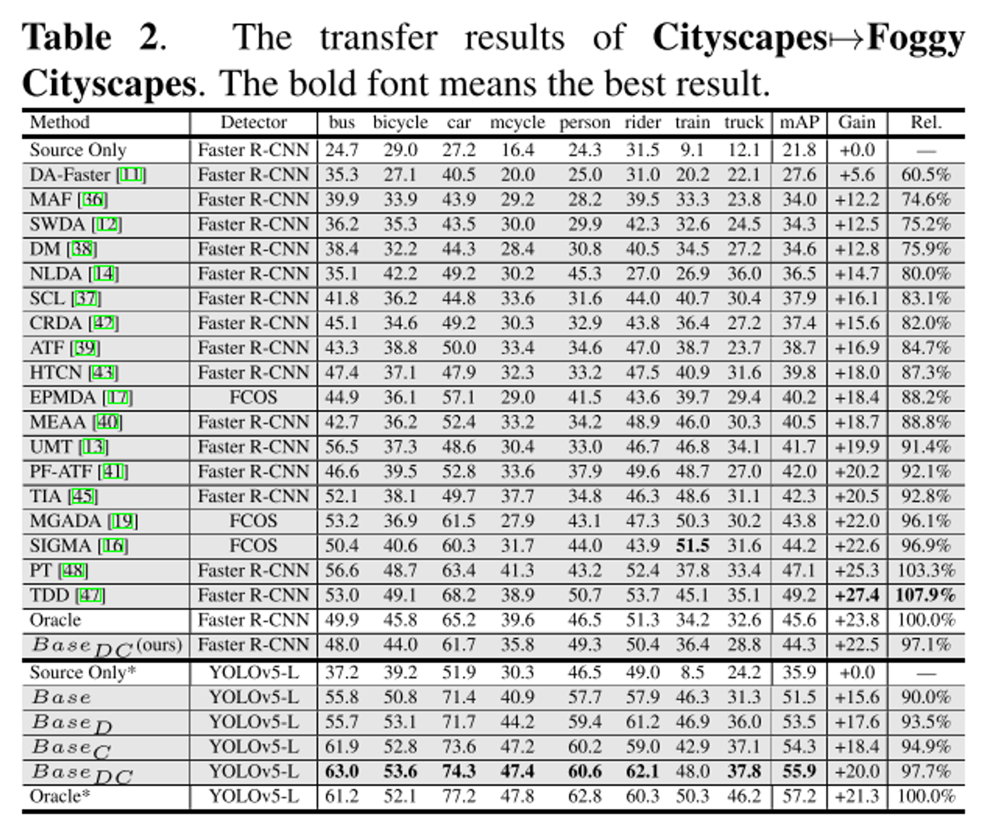 - Outdated detector인 Faster R-CNN과 비교했을때 발전된 Detector가 DAOD 필드에 필요함을 보임.