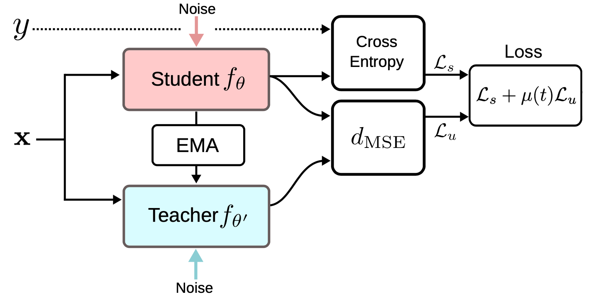 Mean Teacher model은 이미지 분류 task에서 semi-supervised learning을 위해 처음 제안되었다. 해당 모델은 student, teacher이라는 두개의 동일한 모델 아키텍처로 구성된 knowledge distillation 구조를 갖고 있다.