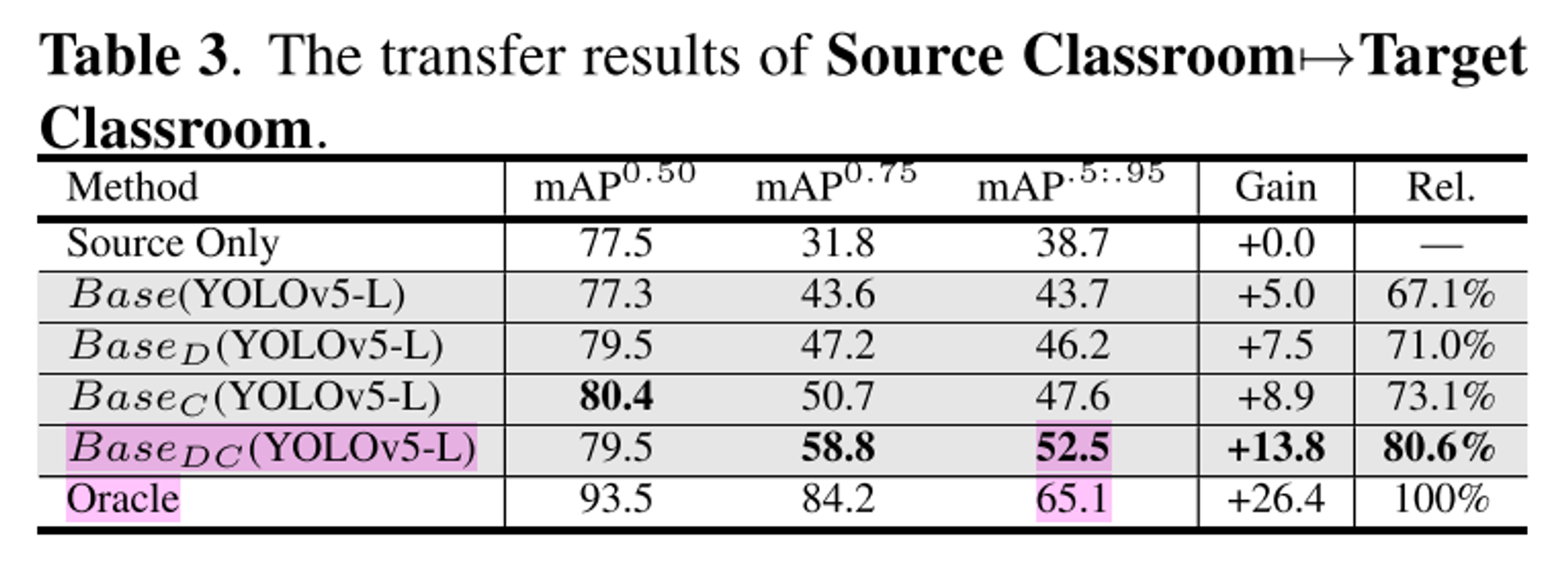 - Base_DC와 Oracle 사이에 여전히 gap이 존재하기는 하지만 실제 교실에서 cross-domain behavior detection에서 accuracy degradation을 완화할 수 있었다.