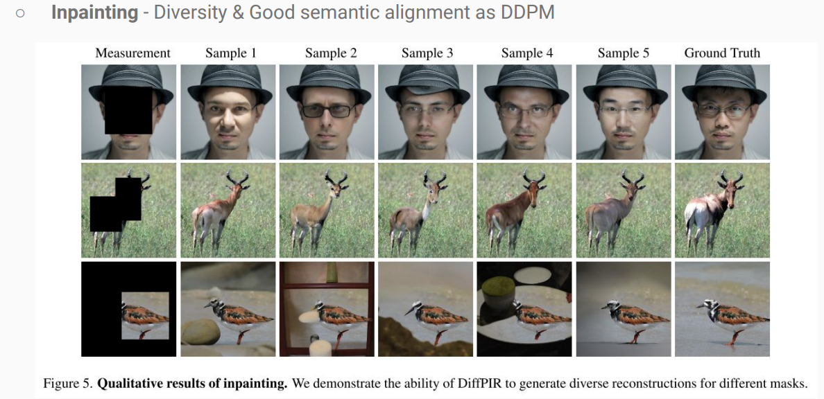 또한,dps는 각 reverse diffusion step “이후”에 measurement를 다룬다는 점에서 diffpir은 reverse할때 y를 활용한다는 점에서 차이가 있고 DiffPIR이 훨씬 빠르게 sampling하는 것이 가능하다.