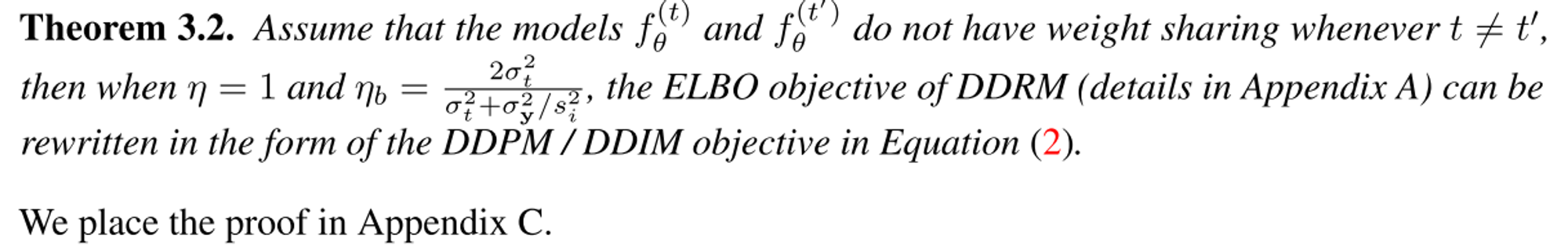 Inverse problem마다 H, $\sigma_y$가 주어지면 다른 모델을 학습시켜야하는데 이 방식으로 선택하게 되면 충분히 flexible하지 않기때문에, 본 논문에서는 DDRM의 optimal solution이 DDPM/DDIM의 optimal solution과 동일함을 보였다.