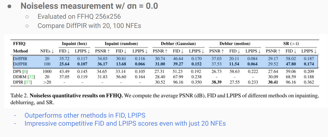 - Image inpainting은 noiseless case만 고려하고, Gaussian blur와 SR은 두 세팅 모두 고려함.