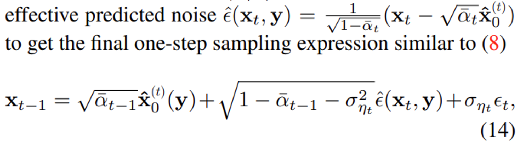 : x_0hat 을 conditional distribution p(x|y)에서 sampling하고, effective predicted noise epision hat (xt, y)를 구해서 / 최종적인 one-step sampling expression을 (8)처럼 얻을 수 있다.