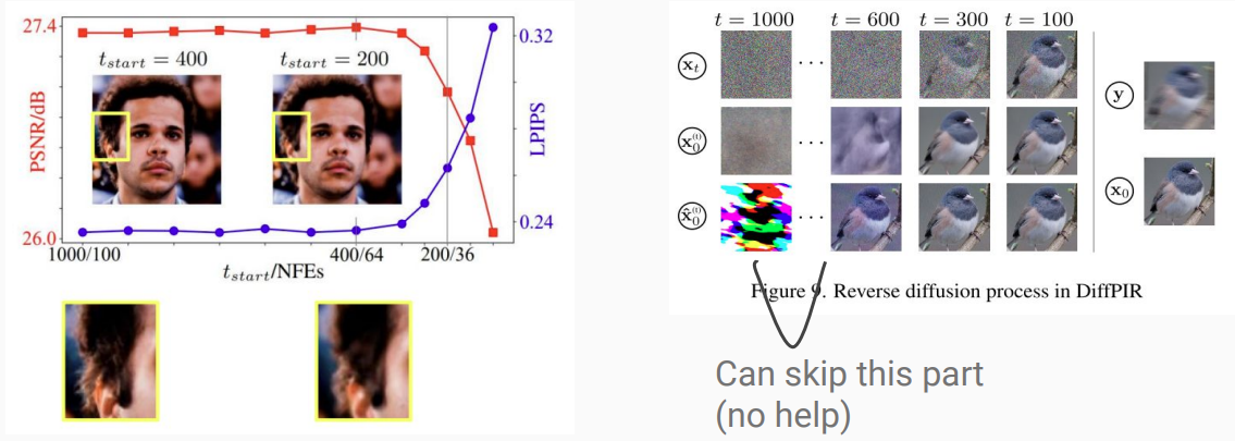 - CCDF와 비슷하게, reverse diffusion process를 partial noised image에서 시작해 실험해본 결과, t_start =400일때도 좋은 성능을 보였다.