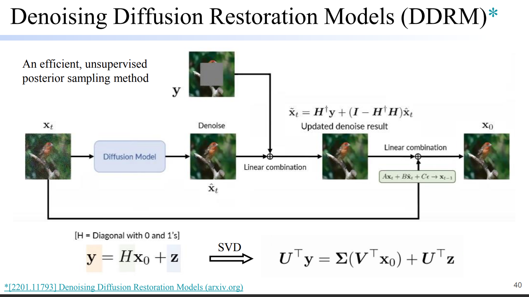 • [32]DDRM - SVD를 사용해서 H의 spectral space에서 y에 있는 missing information들을 복원할 수 있는 diffusioni sampling을 수행